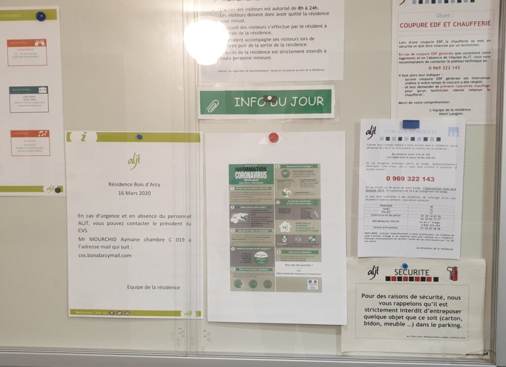 Par conviction et dans un esprit d’engagement, j’ai accepté la mission que la direction a bien voulu me confier d’accompagner les résidents dans cette période de confinement qui est une situation inédite tant pour eux que pour moi-même. Pour rappel, les objectifs de la direction sont globalement de s’assurer de la sécurisation du site et de son fonctionnement à minima et de veiller à prendre des nouvelles des résidents les plus fragiles, isolés ou encore dont l’état de santé nécessite une assistance.